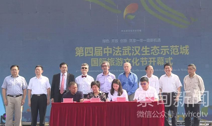 蔡甸區(qū)區(qū)長彭巧娣與法國法中之家旅行集團、武漢朝宗文化旅游有限公司以及湖北中競體育文化傳播有限公司簽訂合作協(xié)議。