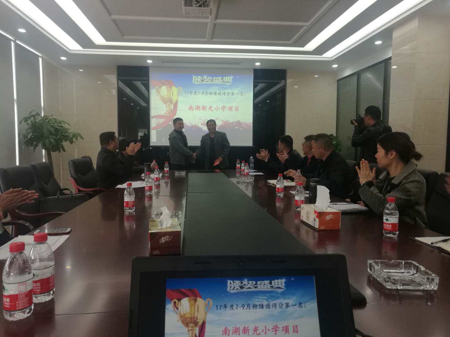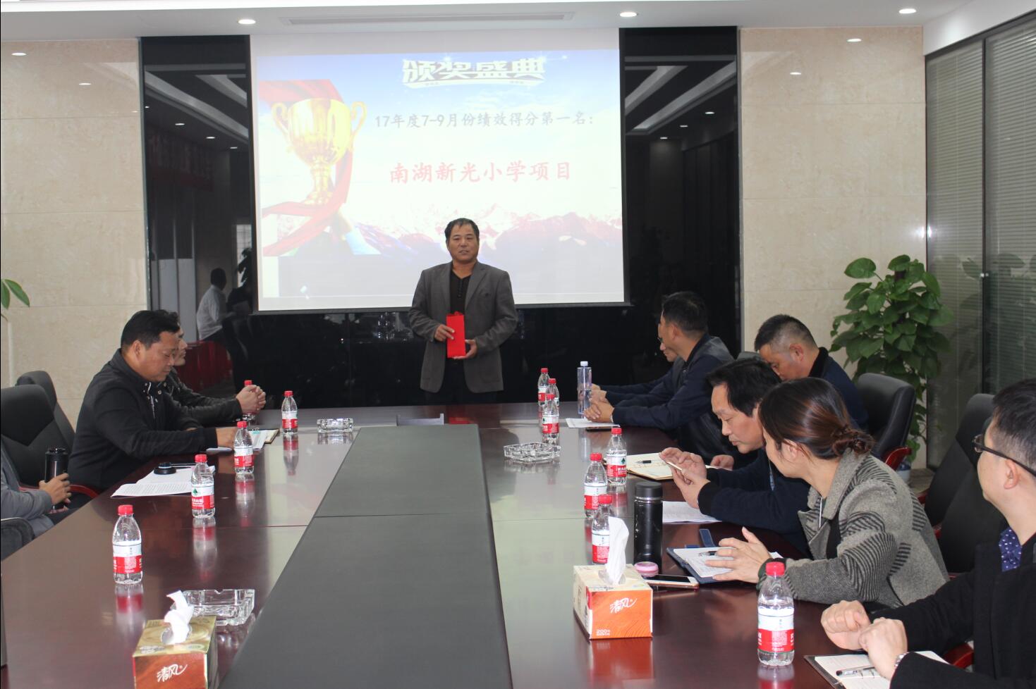 會議開始,由人事行政部公布了上季度績效考評中的冠軍項(xiàng)目——南湖(新光)小學(xué)項(xiàng)目,并由董事長徐濤向冠軍項(xiàng)目頒發(fā)10000元獎(jiǎng)金!