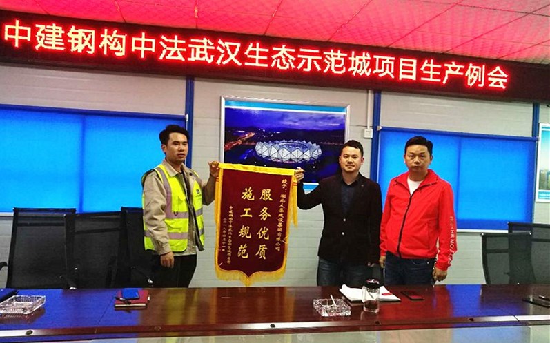 2018年4月13日,由集團(tuán)公司參與承建的中法新城規(guī)劃館項(xiàng)目獲得中建鋼構(gòu)嘉獎(jiǎng),授予“施工規(guī)范,服務(wù)優(yōu)質(zhì)”的錦旗,項(xiàng)目經(jīng)理徐斌和工程部副部長陳超共同接受了這一榮譽(yù)。