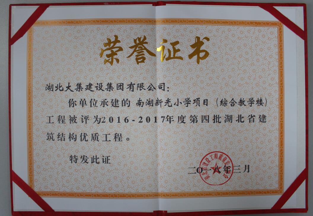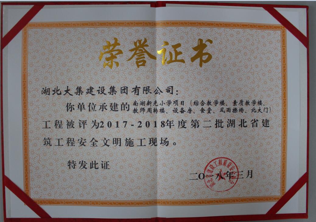 南湖新光小學項目(綜合教學樓、素質教學樓、教師周轉樓、設備房、食堂、風雨操場、北大門)工程被評為2017-2018年度第二批湖北省建筑安全文明施工現場(楚天杯);綜合教學樓工程被評為2016-2017年度第四批湖北省建筑結構優(yōu)質工程!