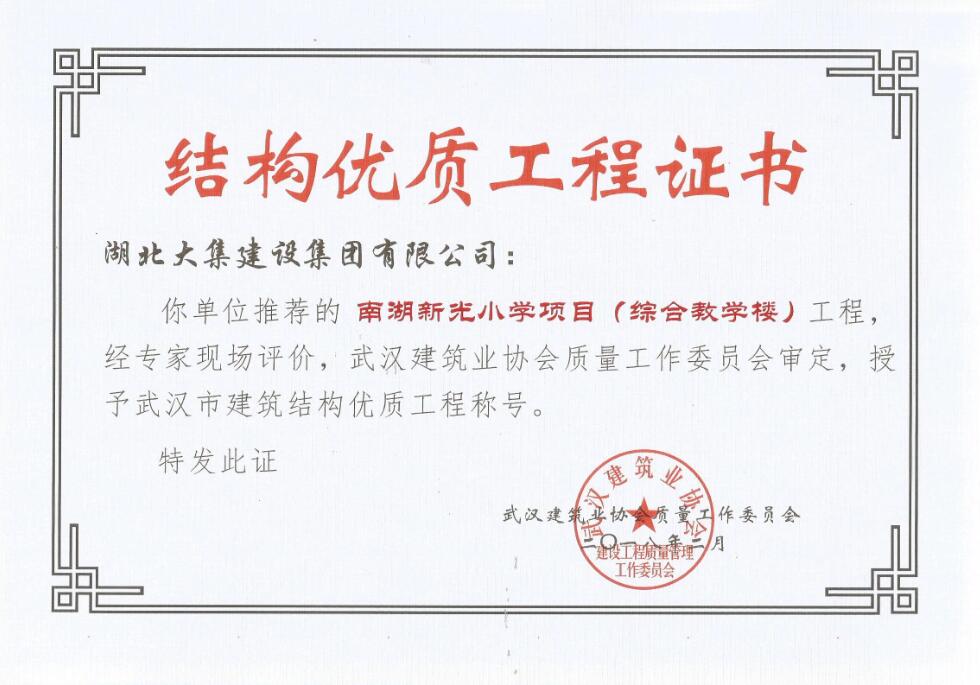 湖北省建筑結構優(yōu)質工程榮譽證書