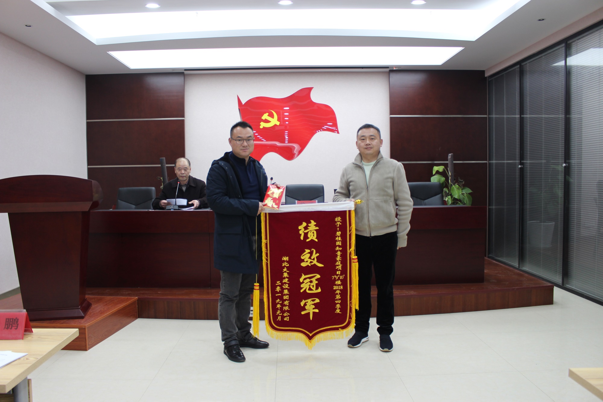 會議開始,集團(tuán)董事長徐濤為2018年第四季度項目績效冠軍——碧桂園知音豪庭7、9、10#頒發(fā)錦旗和獎金。