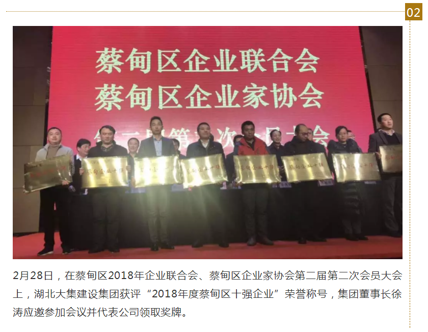 這一份份榮譽(yù)不僅是對(duì)集團(tuán)過往努力的肯定,對(duì)集團(tuán)全體員工齊心奮戰(zhàn)的表彰,也是對(duì)集團(tuán)未來的積極鞭策,更為我們提出了新的要求!新的一年,湖北大集建設(shè)集團(tuán)將繼續(xù)秉持“精品理念”,踐行“工匠精神”,不忘初心,攻堅(jiān)克難,勇于開拓,扎實(shí)奮進(jìn),在新時(shí)代中譜寫集團(tuán)發(fā)展新篇章!
