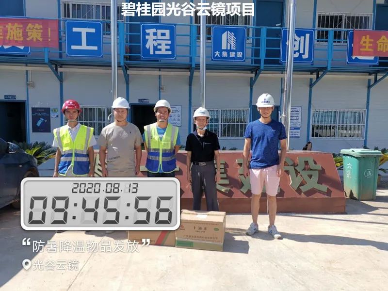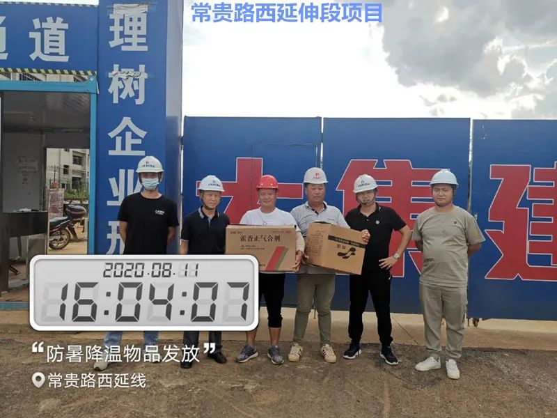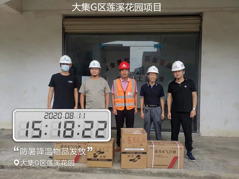 大集G區(qū)蓮溪花園項(xiàng)目、大集街農(nóng)村污水治理項(xiàng)目、大集景綠網(wǎng)紅特色小鎮(zhèn)項(xiàng)目、世茂龍灣47#號地塊別墅樓工程、黃星大道加油站項(xiàng)目、年產(chǎn)80萬套總成項(xiàng)目、常貴路西延伸段項(xiàng)目、泰禾君悅花園項(xiàng)目、碧桂園光谷云鏡項(xiàng)目……每到一處,集團(tuán)工程部都會(huì)將購買好的毛巾、風(fēng)油精、人丹、十滴水、藿香正氣水、蚊不叮等防暑降溫物資送到項(xiàng)目人員手中,并要求各項(xiàng)目部一定要把施工人員的身體健康放在首位,要在全力以赴抓質(zhì)量、搶進(jìn)度、創(chuàng)佳績的同時(shí),嚴(yán)格按照國家有關(guān)規(guī)定,把防暑降溫工作落實(shí)好、做到位,要根據(jù)天氣氣溫的變化,合理安排工作時(shí)間,作好安全預(yù)防措施、備足防暑降溫物質(zhì),讓員工們安全度過高溫天氣。