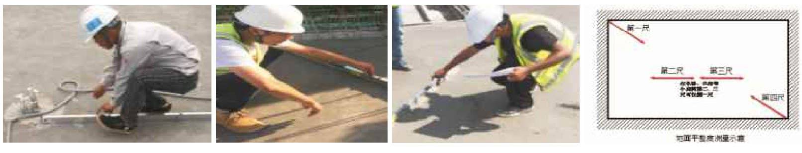 2.任選同一功能房間地面的2個(gè)對(duì)角區(qū)域,按與墻面夾角45度平方靠尺測量2次,加上房間中部區(qū)域測量一次,共測量3次。客/餐廳或較大房間地面的中部區(qū)域需加測1次;